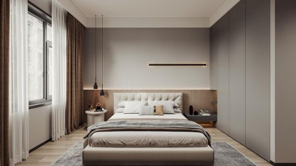 设计思路:因常住人口为2人,将减少其中一个卧室,改为衣帽间等储物空间,客厅与阳面的卧室打通,保留主卧室和北卧室,整体以意式风格进行设计。