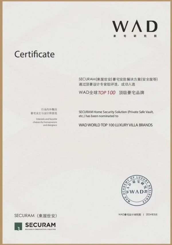 多年耕耘豪宅全屋安防市场,SECURAM东屋世安更深刻地了解豪宅高净值人群的需求,为客户提供更加精准、个性化的高安全产品和解决方案。得益于在豪宅市场显著成就,在2024WAD全球豪宅设计建造专业峰会上,SECURAM被评为“全球TOP100顶级豪宅品牌”。通过专业产品和服务,赢得业内口碑,东屋世安将与整个行业一起,倡导和推动高安全价值体系在顶豪市场更广泛落地。