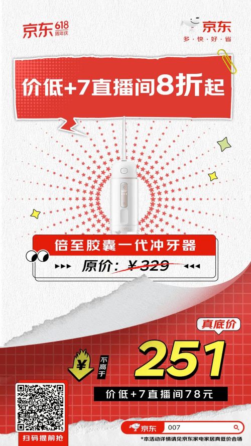 冲牙器作为口腔护理的得力助手,能够深入清洁牙缝,有效预防口腔问题,是维护口腔健康的必备之选,也可趁着618为自己选购一款合适的。倍至胶囊一代冲牙器,价格便宜,性能还不错,它的水流设计非常人性化,温和而舒适,即使对于牙龈敏感的用户也不会产生刺激感,更重要的是它提供了多种洁牙模式,包括柔和、标准和劲爽模式,可以根据自身的口腔环境和需求选择合适的模式,定制个性化的洁牙方案。同时,它的小巧机身设计方便用户轻松掌握,使得洁牙过程更加便捷和舒适。5月20日李佳琦直播间329元,京东家电家居采销直播间只要251元。