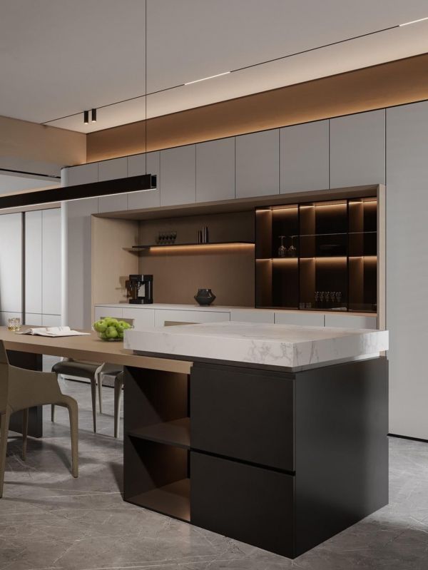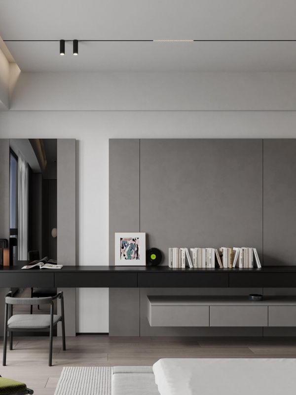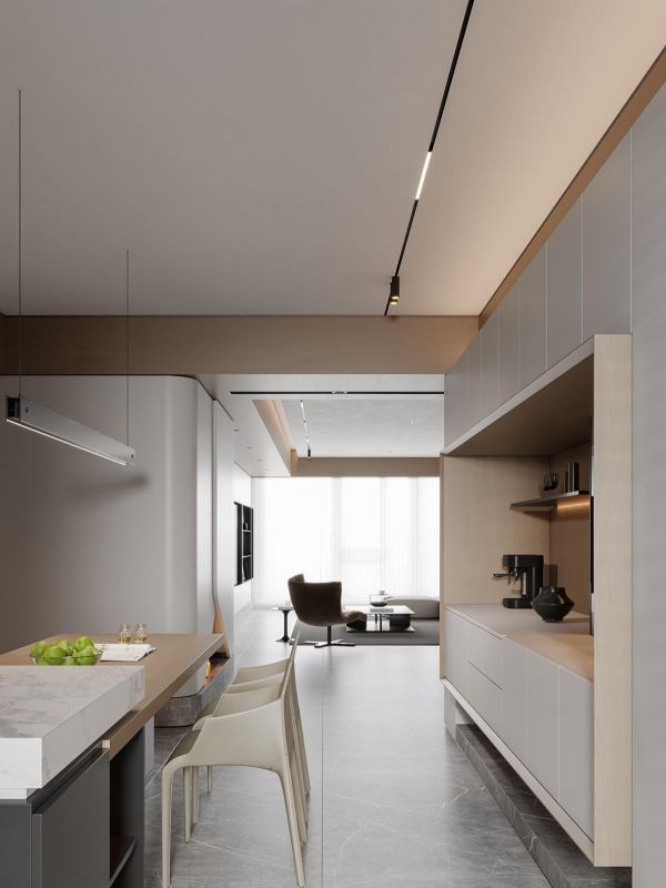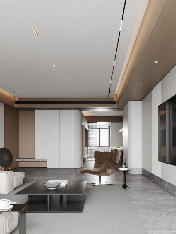该设计整体色调以白色和灰色为主,这种色彩搭配使得空间显得简洁而大气。木质元素的加入,不仅增添了空间的自然感,也为整体设计增添了一抹温馨。