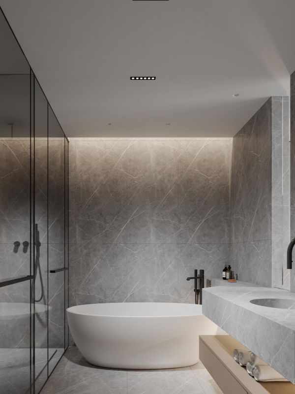 整个房间的地面铺设了灰色的大理石瓷砖,这种材质不仅耐磨易清洁,还与室内的家具和装饰相得益彰,使得整个空间更加和谐统一。