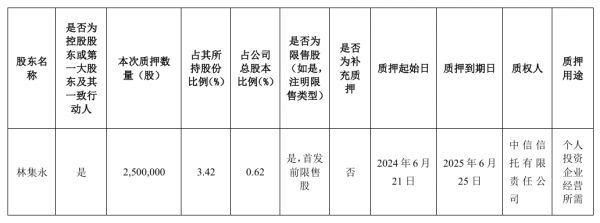 公告称,林集永先生本次质押融资的主要还款资金来源包括自有资金或其他自筹资金等,具备良好的资金偿还能力。