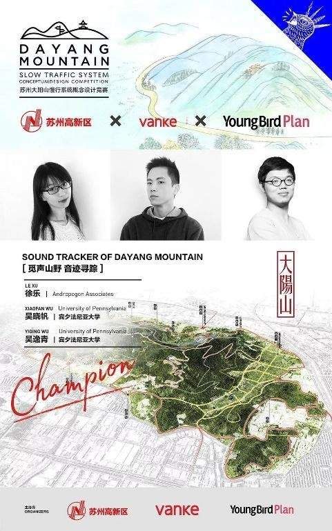 在大阳山森林公园设计竞赛中,吴逸青与徐乐,吴晓帆共同完成的设计方案获得了第一名。在竞赛过程中,他们发现大阳山是本地鸟类的重要栖息地,同时也在南北鸟类迁徙的道路上。因此他认为设计应该从场地本身的鸟类出发,利用慢行系统规划大阳山现状的同时,以声音为媒介,将大阳山的生态之美化为虫鸣鸟叫,通过手机app的搜索记录,结合强大的生态寻声系统,为每一个人打造一个全新的、属于自己的大阳山。该作品赢得了评委和大众高度认可,一举斩获桂冠,荣膺本季赛事最佳设计。
