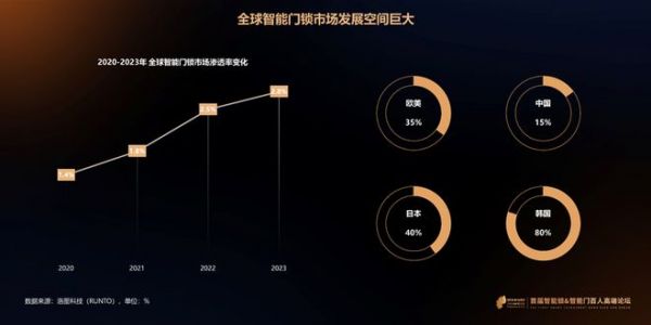 2023年,全球门锁市场中,智能门锁的渗透率仅有2.8%。分地区来看,韩国渗透率最高,达到80%;欧美和日本均在35%~40%;中国渗透率为15%。大量的发展中国家和地区在5%以内。