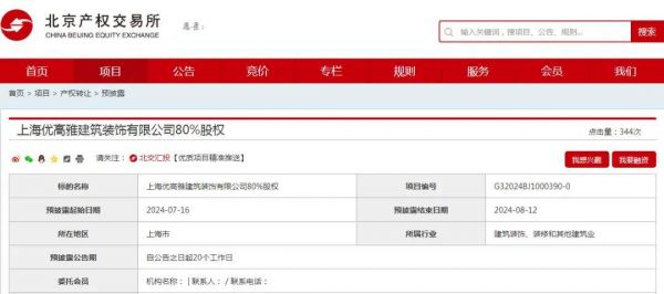 7月16日,据北京产权交易所,国有控股企业优高雅有限公司拟挂牌转让北京优高雅装饰工程有限公司、上海优高雅建筑装饰有限公司各80%股权。