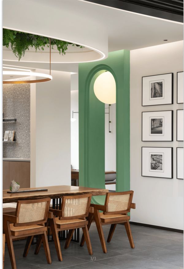 阅读区兼具会客与交谈等多重功能,不同行为的发生让空间具有着不同定义,在原木色调的映衬下,内嵌圆球景观的镂空门成为空间的点睛之笔,排列整齐的装饰画、折射优雅灯光的金属吊灯点亮与自然相伴的诗意。