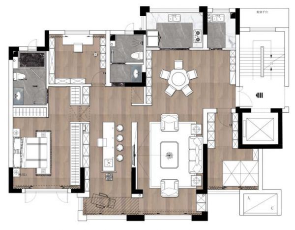 本案属于现代风格,基调为黑白灰,辅以浅色系衬托,有格调但又不失那隶属于家的一份暖意。