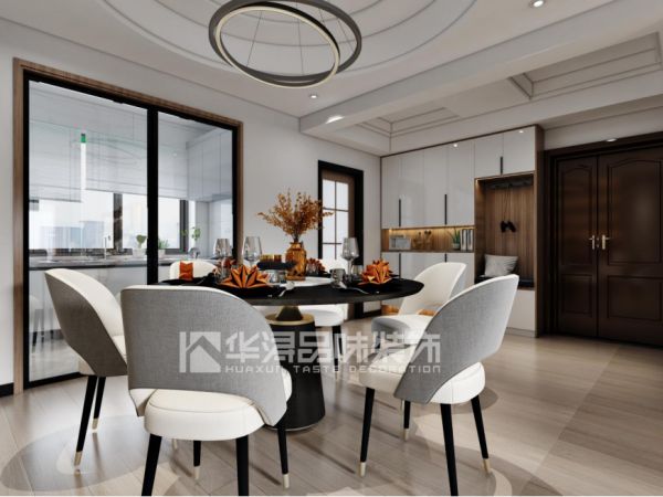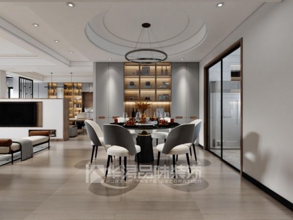 餐厅位置用圆形餐桌搭配圆形吊顶,正好天地呼应,正是中华传统所说的“圆圆满满”。