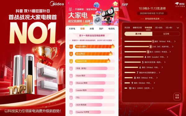 2025年双十一空调大战已经打响,美的空调在多平台表现强劲,展现出全渠道领先优势。据最新数据显示,在淘系平台,美的位居全站空调品牌榜首位;在京东中央空调竞速榜中,美的中央空调同样位列第一;而在抖音平台“双11疯狂国补日”活动中,美的空调则登上大家电榜单榜首。