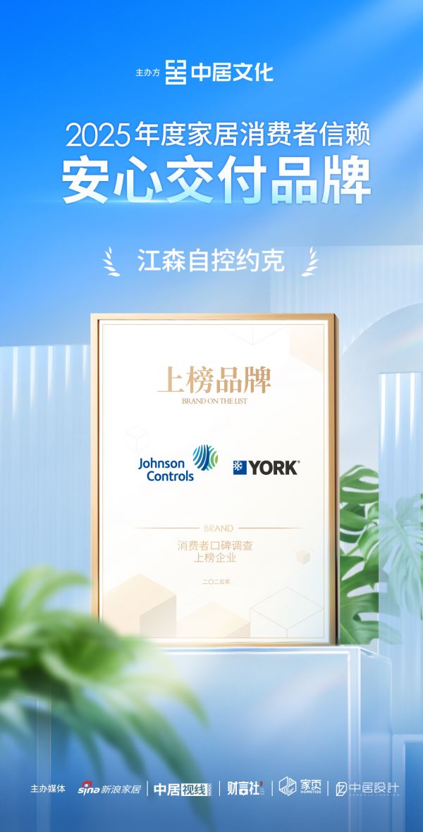 在本次评选中,江森自控约克凭借优越的产品质量、良好的消费者口碑,获得消费者和行业的高度认可,从上百家家居品牌脱颖而出,荣膺「2025年度家居消费者信赖安心交付品牌」称号。