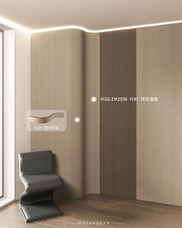S型圆弧板包含R200等多种弧度规格,通常用于打造具有波浪形、曲面造型的家具表面或背景墙造型,S型曲线自带艺术感和动态美,为墙面和空间增添别致的装饰元素,营造空间的节奏感和流动感。