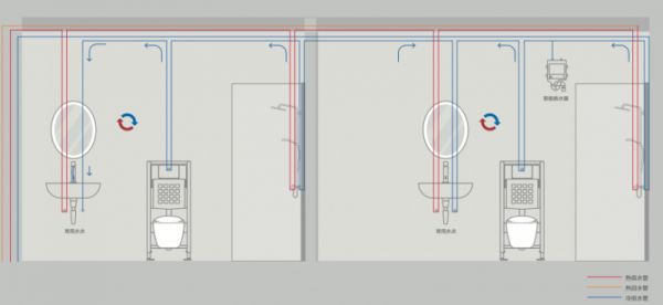想要彻底解决,消除这些死水段,必须从源头着手。吉博力智洁活水系统采用双向环路设计,确保任何一个卫生间器具的使用都能让整个给水管道内的水流动起来,有效避免了死水段的产生。