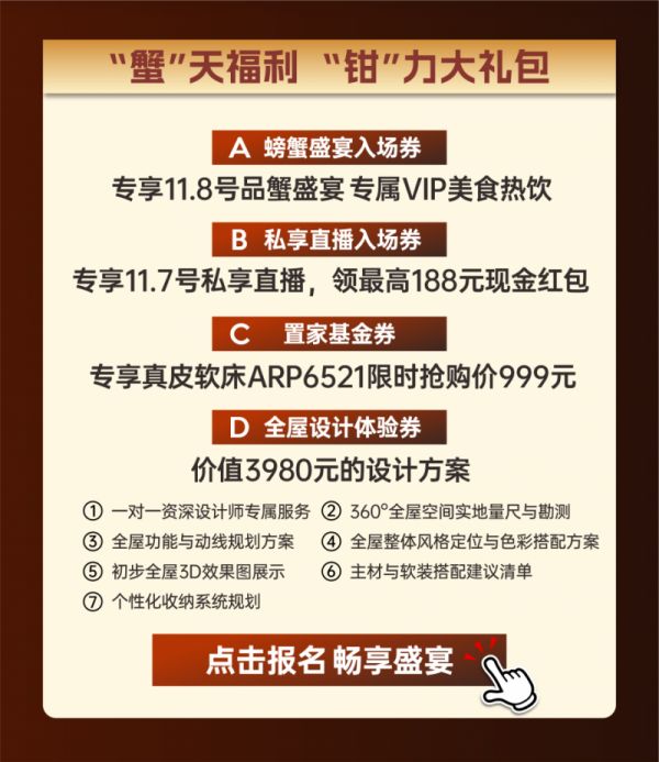 作为本次活动的重头戏,是太子家居为VIP客户特别策划了“品蟹宴”专属环节。11月7日,私亨直播间将为VIP们带来线上互动惊喜,参与者不仅可云端了解家居潮流,更有机会领取现金红包。11月8日,受邀嘉宾可凭“螃蟹盛宴入场券”享受精心准备的时令蟹宴及美食和热饮,在馥郁蟹香与温馨氛围中,感受品牌对细节与品味的追求。