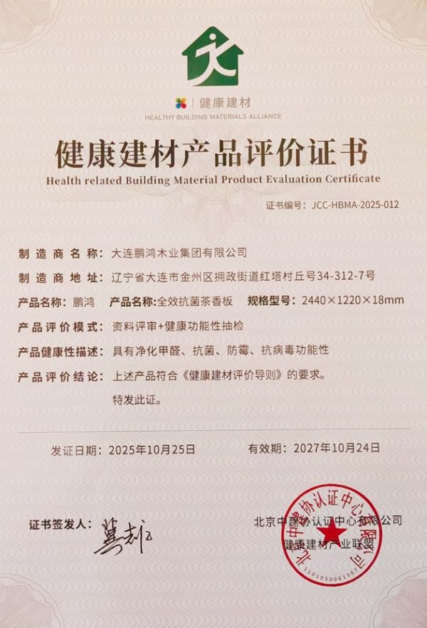 论坛期间,鹏鸿的全效抗菌茶香板凭借其卓越的抗菌性能与极致的环保表现,通过了专家团的严苛评审,荣膺“功能型健康建材”认证。这不仅是一款产品的胜利,更是鹏鸿创新实力的体现。其所倡导的 “五效合一” 产品理念,集 抗菌、防霉、抗病毒、净醛、释香 于一身,重新定义了健康板材的新标准,打破了传统板材功能单一的局限。