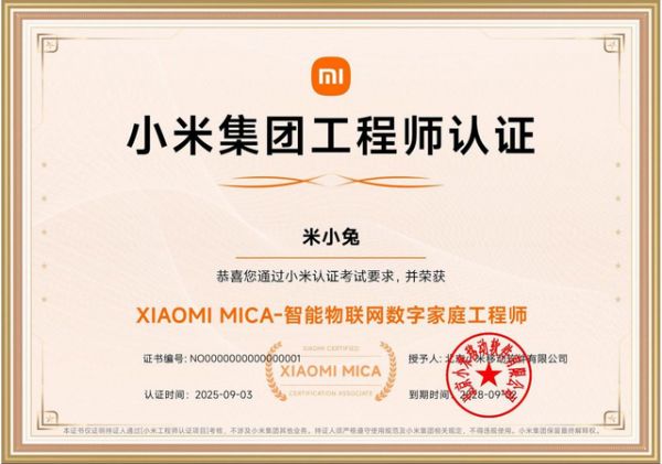 在系统化培训与实战锤炼之后,最终环节是严格的“XIAOMI MICA智能物联网数字家庭工程师”认证考试。该认证由小米集团权威发布,是行业认可的专业能力凭证。