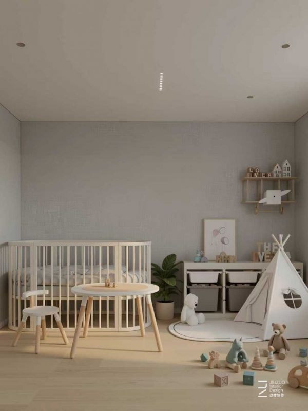 墙上的艺术画作以几何形态与莫兰迪色调点缀,看似简单的色彩组合,实则是设计师为孩子精心准备的“色彩启蒙课”:让他们在日常起居中,悄然建立对美学秩序的最初认知. “触摸是孩子认识世界的本能”,设计师在空间中运用木材、棉麻等天然材质:STOKKE婴儿床的木质纹理传递者自然的温度,棉麻的柔软触感安抚者孩子的触觉神经,原木小桌椅的肌理则邀请孩子用小手去探索“粗糙与光滑的差异”.