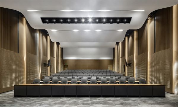 与时俱进,提升竞争力。为了支持讲座和内部培训的需求,顾客布置一个大礼堂,层层抬高的设计使得后排观众的视线不受限,搭配震旦EAFF条桌和视听椅,约可容纳 150 人参与活动。