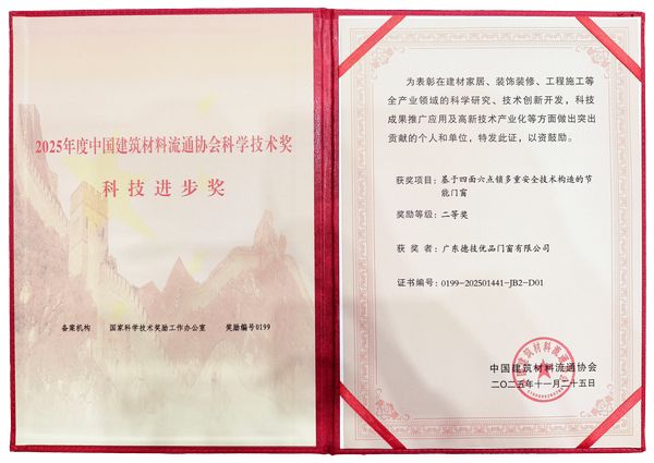 科学技术奖每年评审授奖一次,聚焦项目的技术创新性、成果转化能力及经济社会效益,在行业内具有极高含金量,是衡量企业科技实力的重要标杆。此次评选历经多轮严苛审核,从技术独创性、应用价值到行业推动作用等多维度综合考评,德技优品门窗能够脱颖而出,核心得益于其自主研发的 “四面六点锁” 发明专利及配套技术体系的突出表现。