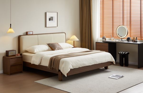 胡桃木色床体搭配浅飞絮白靠包,色调柔和温馨。生态科技皮软包床屏,触感细腻,倚靠舒适,表面拉线工艺勾勒出立体层次。橡胶木实木边框打磨圆润,形态自然柔和。椭圆形实木底脚嵌入床体,稳固支撑每夜好梦。