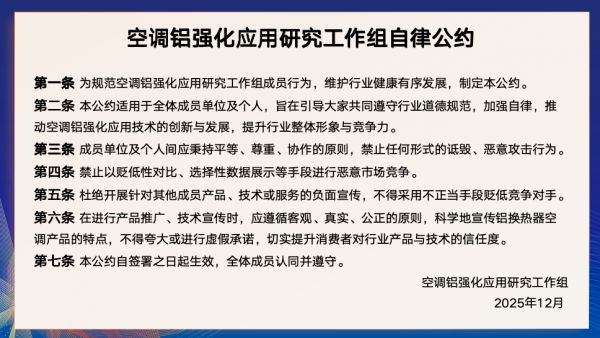 2025年12月11日,工作组成员单位正式发布《空调铝强化应用研究工作组自律公约》,明确禁止贬低性对比、选择性数据展示、虚假宣传等不正当竞争行为,要求所有 “铝代铜” 产品必须通过严苛实证测试和可靠性验证,确保质量不下降、性能不打折。