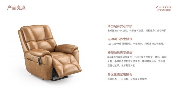 左右沙发以“幸福不远 就在左右”为核心理念,将智能科技与家庭关怀深度融合。妈妈的沙发采用电动调节养生躺位,113-125°一键控制,轻松适配各种生活场景。看电视时,功能位打开托起双腿,缓解久坐疲劳;听收音机时,靠背躺下,享受惬意时光;午间小憩,不需挪动,即可舒适放松。这些细节,无不体现对妈妈日常需求的细致洞察。