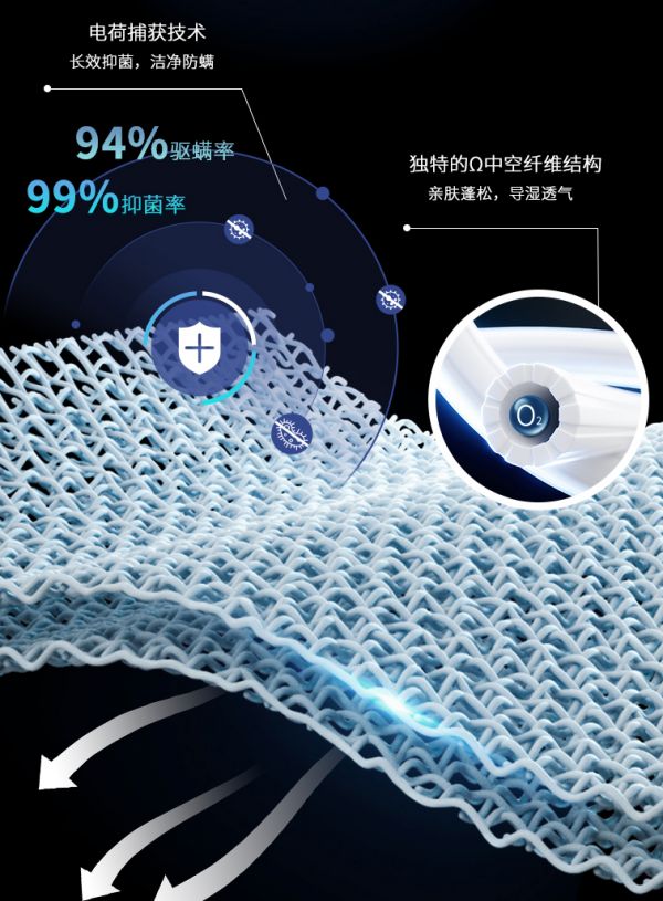 DACRONFRESH抗菌防螨纤维—其独特的Ω型中空高回弹结构,触感如云朵般轻柔蓬松,长期使用也不易塌陷变形,始终保持均匀支撑力。纤维表面密布的天然孔隙,还能构成高效空气循环通道,整夜加速湿气排散,让肌肤始终处于干爽舒适的状态。该纤维更通过了SGS权威认证,其搭载的电荷捕获技术可实现长效抑菌防螨,抑菌率高达99%,螨虫驱避率达94%,能从源头减少螨虫附着与过敏原滋生,以双重防护为洁净睡眠筑起坚实屏障。