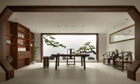 “大隐隐于市,觅得一处心安之地”,书房是修身养性的精神栖所。皮阿诺以沉稳木色与素净浅调为基底,木纹的温润触感与自然意趣相融,营造出沉浸式阅读办公的静谧场域。多边形门框的几何线条强化中式韵味,作为空间过渡的 “画框”,而木材的细腻质感让这一设计更显精致。产品将庭院的苍松、山石景致自然 “借” 入室内,室内外意境无缝衔接,在笔墨书香中,木皮的温润与空间的静谧交织,为精神栖居提供了绝佳载体。
