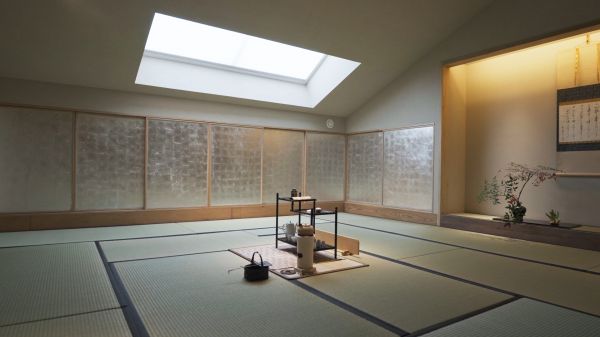 被设计师悄然置于二层的和室,则以“光影与禅意”为核,将传统和室元素与现代采光巧妙交融。斜顶天窗引入柔和天光,消解了上层空间的封闭感;障子门的朦胧、榻榻米的温润、茶器架的极简线条与花艺的疏朗姿态,在明暗交错中晕染出留白的诗意——既留存茶道空间的仪式感,又以当代设计语言重构了传统的静穆气质。