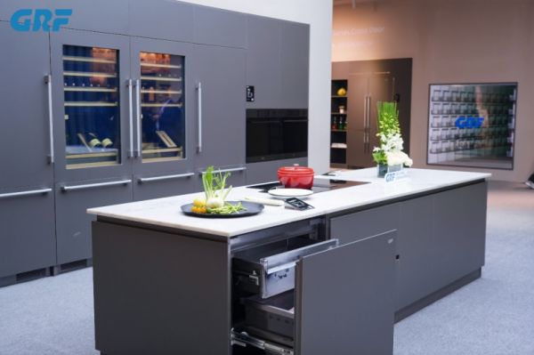 具体来说,GRF的嵌入式厨电生态系统包含:全嵌入式冰箱、零平嵌冰箱、全嵌抽屉式冰箱、嵌入式洗碗机、嵌入式蒸烤一体机、嵌入式电磁灶、嵌入式油烟机等,涵盖了几乎所有的厨房电器。用户可将同一材质、同一颜色的门板覆盖于冰箱、洗碗机等设备之上,从而让功能性电器隐入整体橱柜的立面造型之中,实现真正的视觉统一。