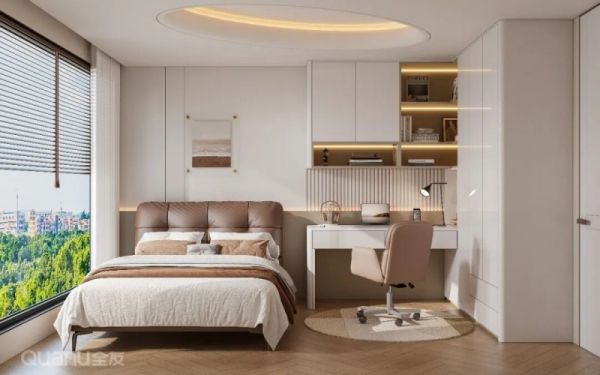 对于带飘窗的卧室,可利用飘窗定制书桌,转角与衣柜自然衔接,既利用了天然采光,又实现了衣物收纳与高效办公。
