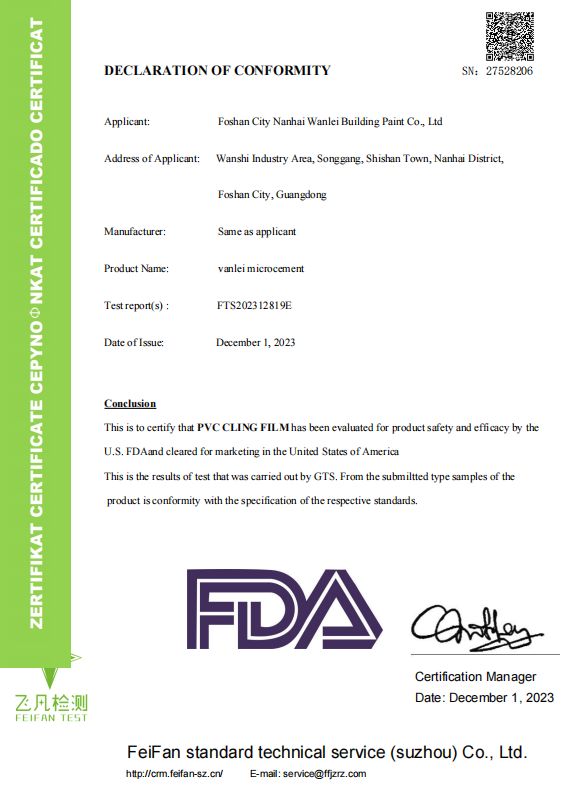 A:最大的优势是有害物质的"未检出"和"食品级"安全。万磊微水泥不仅VOC排放为最高等级A+,其检测报告更明确显示甲醛、乙醛释放量为"未检出",且通过美国FDA食品接触材料标准,这意味着其安全性达到了可应用于婴幼儿用品级别的信任度。