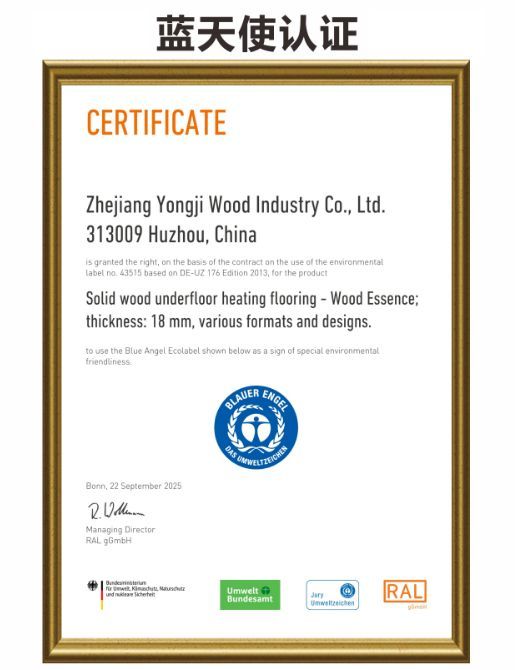 永吉地板获得全球顶级“蓝天使认证”行业首创 全国第一