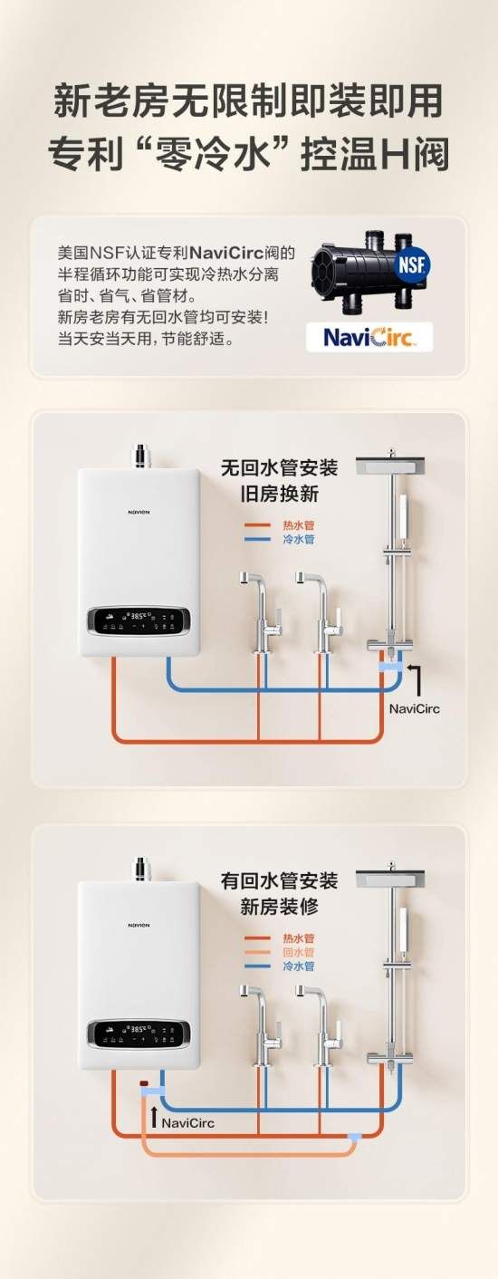 恒温的持久实现,更离不开硬核的“身体素质”。NGW580C采用专利不锈钢热交换器,其抗腐蚀、耐冲刷的特性,不仅寿命远超传统铜质换热器,更能保证流经水质的纯净。而AI智能零冷水系统则如同贴心的热水管家,通过学习用户习惯或通过手机预约,提前预热管路,实现“即开即热”,彻底告别开机时的那段冰冷等待。其专利零冷水控温H阀(获美国NSF认证),兼容新旧户型,在提升舒适的同时兼顾了节能与安装便利。
