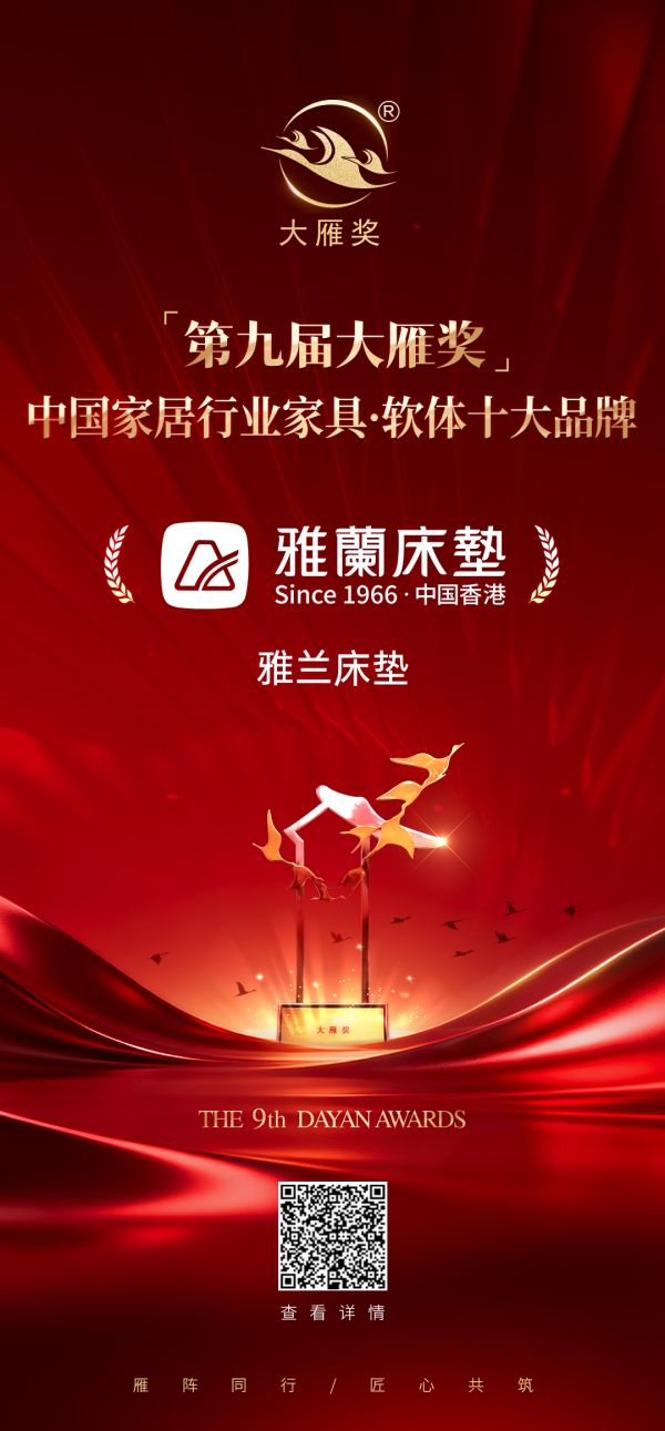 喜报!雅兰床垫荣膺「第九届大雁奖·中国家居行业家具·软体十大品牌」奖项