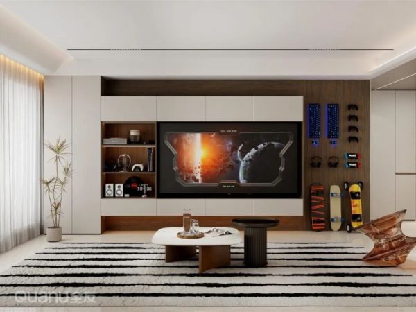 每次玩游戏前,你是否还在翻箱倒柜地找耳机?不如给电视背景墙装块洞洞板,让游戏设备整齐上墙,不仅能随时取用,还能营造出沉浸式的游戏氛围,让客厅秒变专属电竞区。
