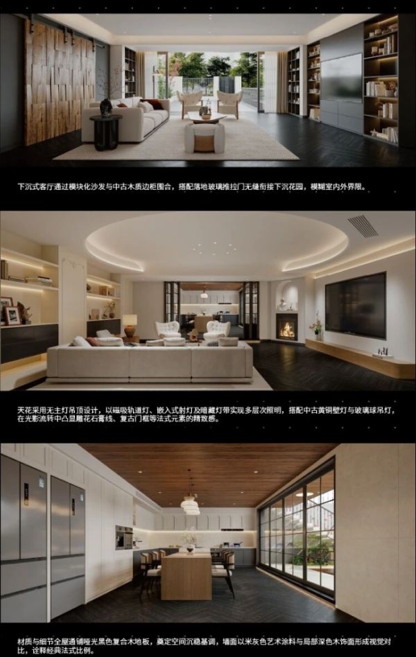 资深设计师刘阳的力作,将现代法式和中古风格融入住宅,以开放式格局串联下沉式客厅与花园,落地玻璃门实现了室内外的隔断,同时又能让光线、清风与绿意自然穿梭,完美契合“天人合一”的生活哲思。材质上,哑光黑复合木地板搭配米灰色艺术涂料,铺就静谧温润的空间基底,局部点缀深色木饰面,于法式优雅中揉入东方独有的内敛质感;更甄选中世纪现代主义的经典单品融于空间,让现代生活的舒适便捷与岁月沉淀的隽永气韵相融共生,勾勒出兼具格调与温度的理想人居。