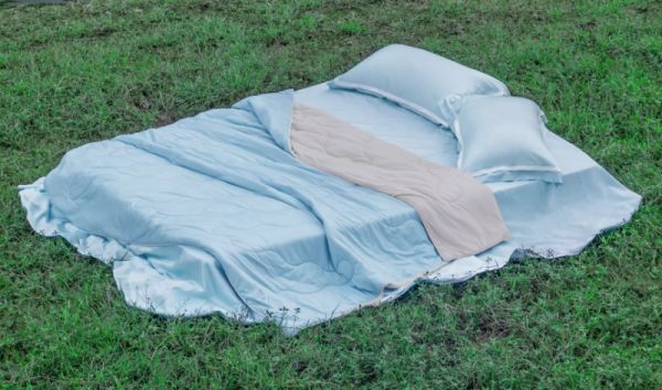 针对夏季睡眠中常见的“前半夜燥热难眠、后半夜黏腻出汗”痛点,新款夏凉被构建了独特的“双重凉感系统”: