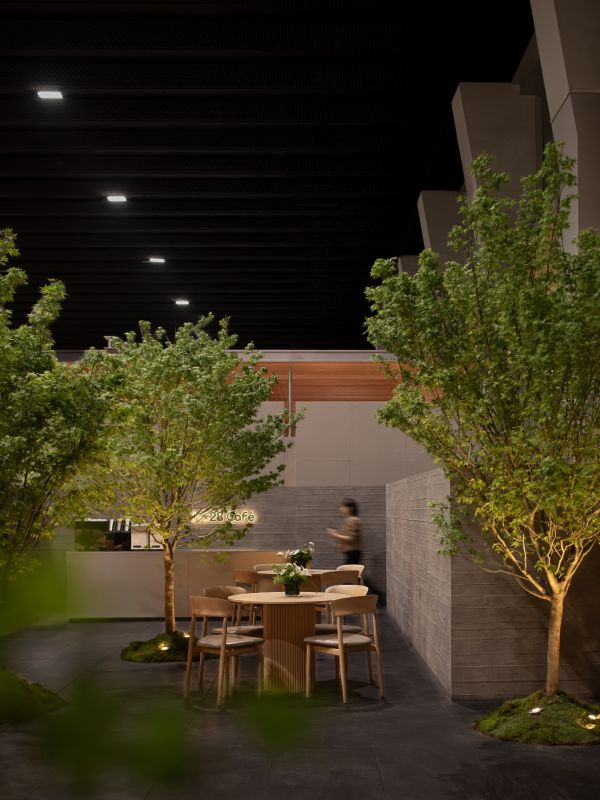 远观HC28 maison展位,像几组被安置在展馆内的生活街区。不同体量的空间彼此独立,又通过动线自然连接——既有完整封闭的“家”,也有向外开放的HC28 Café,使整个展位呈现出一种介于居住与公共生活之间的城市片段。