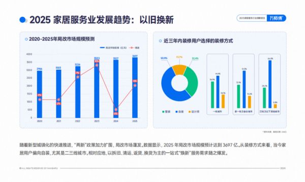 在个性化需求的驱动下,局部改造市场蓬发。报告数据显示,2025年局改市场规模预计达到3697亿,超半数居民偏向自装。