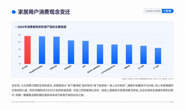 在信息壁垒逐渐瓦解的消费者主权时代,家居消费的决策路径发生了根本性转变。曾经“线下重体验”的模式,已被“线下轻体验+线上比价购买”的新习惯取代。线上渠道凭借价格透明、选择丰富、时效便捷的优势,成为家居消费的主阵地。
