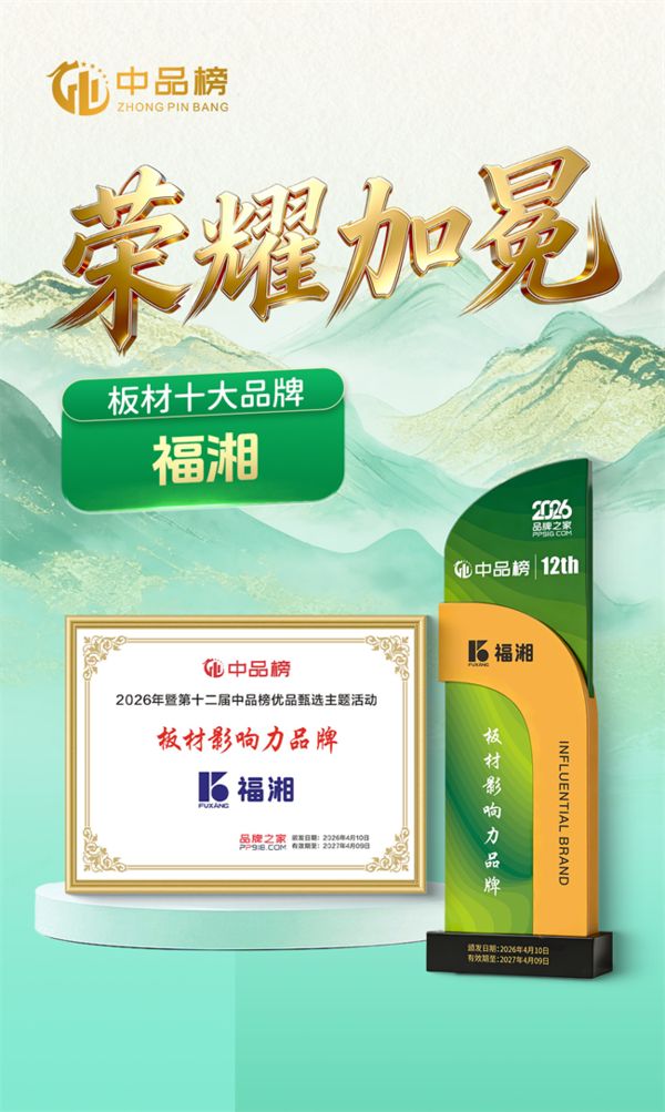 2026年4月1日,第十二届“中品榜”优品甄选活动圆满落幕,各大品类十大品牌榜单正式揭晓。在这场行业盛会中,深耕板材领域三十余载的福湘板材凭借深厚的品牌积淀、卓越的产品品质与突出的技术实力,成功斩获“板材十大品牌”“阻燃板十大品牌”双项殊荣,用实力诠释行业标杆担当,彰显其在板材领域的核心竞争力与广泛市场认可度。