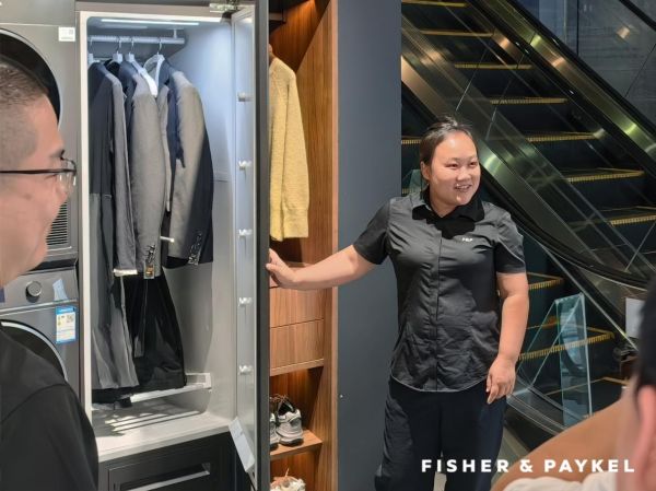 在洗护场景体验区,斐雪派克展示了另一种可能性:洗烘套组和衣物护理柜,不再被粗暴地塞进阳台,而是可以灵活融入衣帽间、主卧套间,甚至玄关区域。