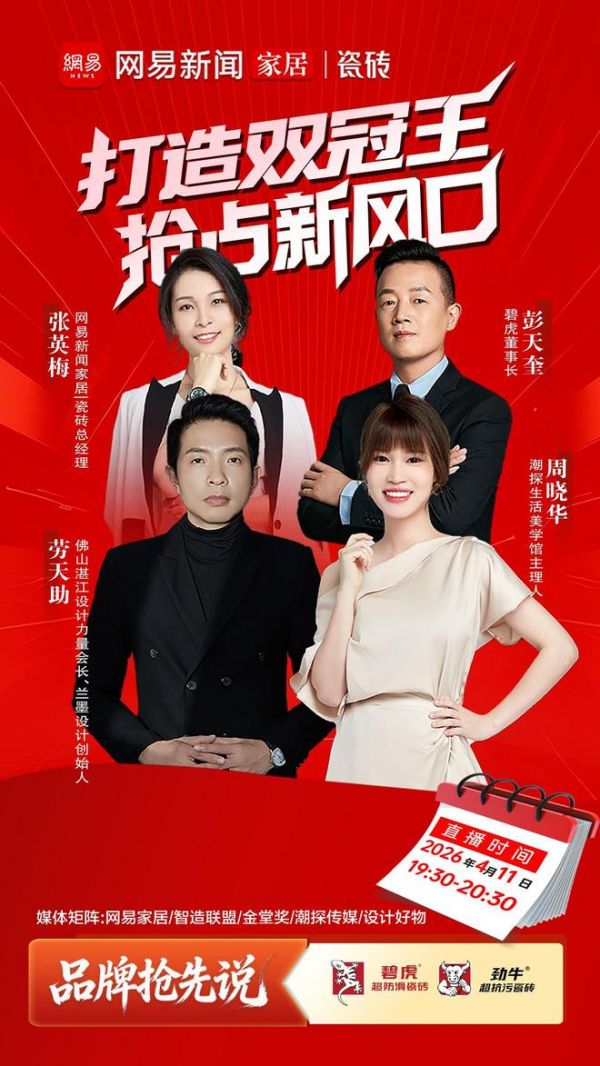 2026年4月11日,《品牌抢先说》栏目特邀,潮探传媒董事长、网易新闻家居|瓷砖频道全国总经理张英梅(YOYO),碧虎董事长彭天奎,佛山湛江设计力量会长、兰墨设计创始人劳天助与潮探生活美学馆主理人周晓华四位重磅嘉宾,在行业深度调整、同质化价格战内卷的背景下,深度拆解碧虎企业深耕超防滑赛道五年后,重磅推出劲牛超抗污瓷砖的底层战略逻辑,解密双品牌双赛道的破局之路,为建陶行业转型升级注入全新动能。