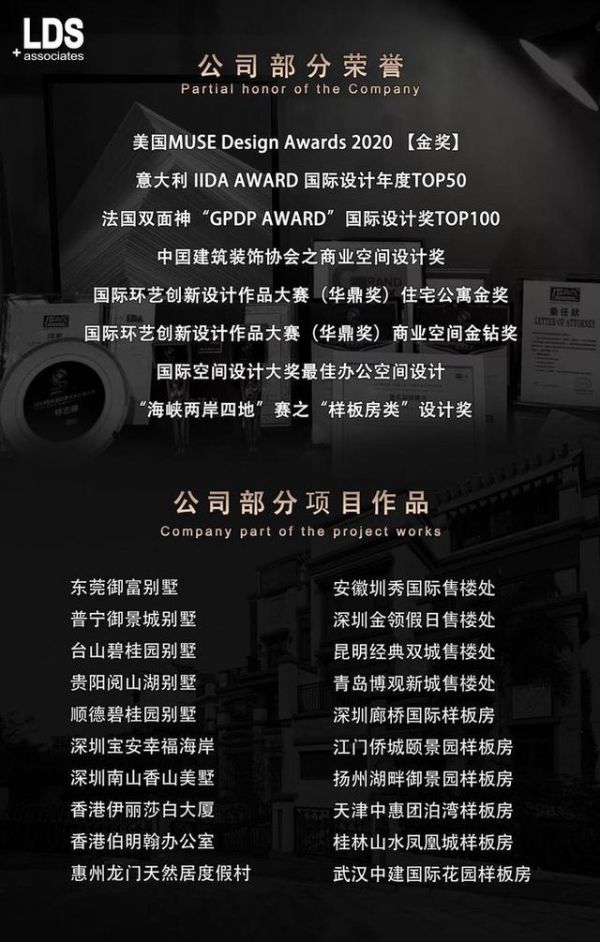 LDS室内设计,由1998年建立于香港,2001年在深圳开创团队,集合深港两地精锐人才。多年来专业和完善的配套服务为广大客户打造高品质设计理念。20年来LDS室内设计 创作了许多不同的项目作品,样板房设计、售楼处设计、住宅设计、别墅设计、办公楼设计,近几年转型于艺术设计。相信他们肯定没错!
