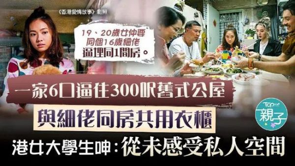 最近一个19岁的港女在网上发帖申诉,自己一家六口住在300尺的公屋,(大约不到30平)跟弟弟睡一个房间还要共用衣柜,这事儿引发了一个讨论,在香港,有多少孩子可以从小自己住一个房间而不用跟别人分享自己的生活空间?