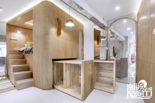 然而,这些被整合功能的体块置入小空间后会出现一些矛盾,特别是在娱乐功能体块置入后, 整个空间的流线与视野都被遮挡。为此,TOWOdesign对原本的设计做出调整,将所有功能体块整体旋转10度后,功能块带来的阻挡问题迎刃而解。同时10度的倾斜也创造出一些有趣的夹角空间。在休息用的盒子旁边,该夹角空间正好容下上床楼梯,楼梯内暗藏收纳柜,灵活又实用。客厅的夹角空间变成三角形造型灯箱,成为客厅的氛围照明灯。