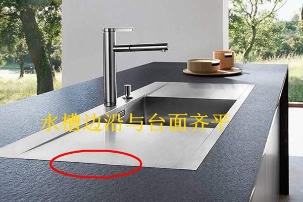 台中盆是指边沿与台面齐平的一种水槽安装类型,它的安装方式也较为复杂,除了要打洞之外,还需要在台面上按照水槽尺打磨一圈,之后将水槽放入,让台面和水槽边沿保持同一水平面。
