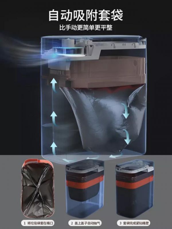 这个垃圾桶有一个逆天的功能,就是每次套垃圾袋儿的时候,再也不用将手伸进去抹一下了,它带有自动吸附垃圾袋的功能,盖上盖子自动抽气,垃圾袋被桶四周贴的平平整整。