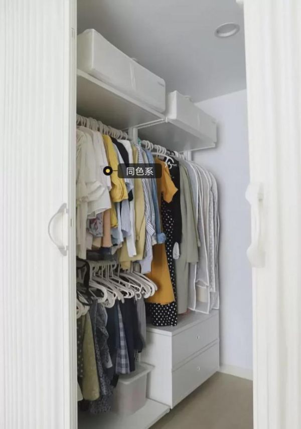 衣帽间的房门我头一次见,有点像手风琴一样的折叠门,可以最大限度的将整个空间打开。空间宽敞进出也方便。整个设计我一眼就相中了,实际上让我觉得很震惊的是,衣帽间虽然小,但收纳力却很强,而且分类明确,整洁有序,一点都不凌乱,同色系的衣物都挂放在一起,颜色深浅衣服长短,以及外套和小衫,都被她分类的明明白白的!看着就觉得很舒坦!