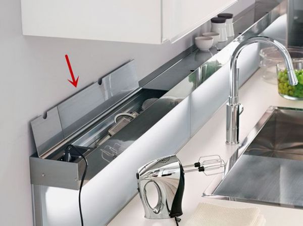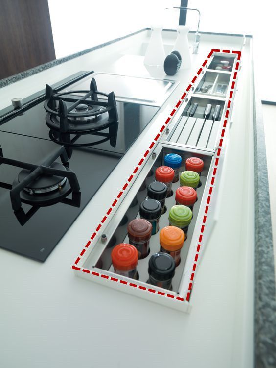 其实沥水架我们之前也跟大家说过,就是在橱柜台面里侧增加一个嵌入式不锈钢槽,水槽前面作为沥水架,备餐区可以存放刀具,灶台前方则收纳调料罐,整体跟台面齐平,看着一点不占空间,如果担心沾到油烟还可以选择加个盖子,不用时盖上,上面的空间照样能用。